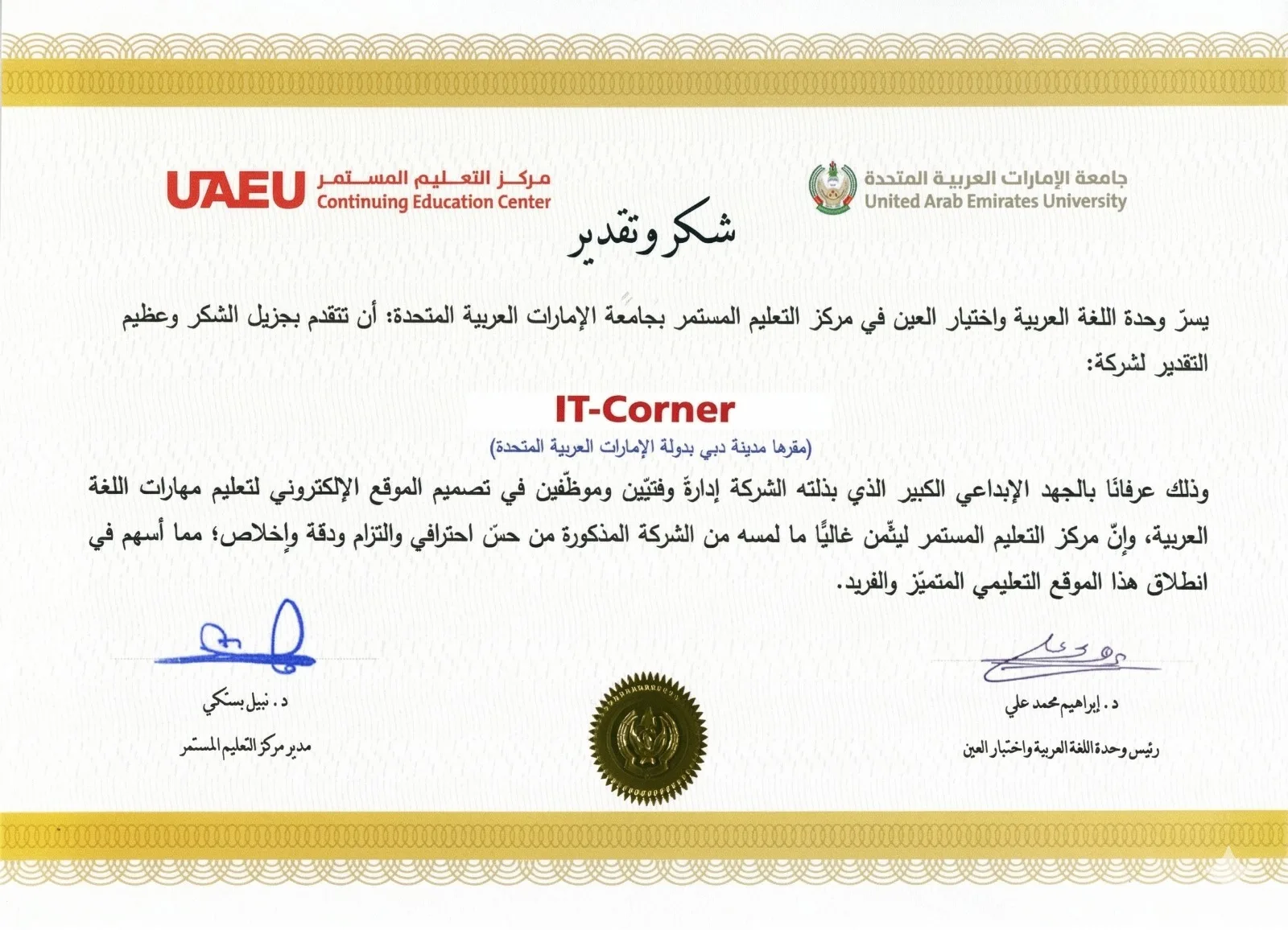 Certificate of Appreciation for developing Arabic language skills platform using a multi-tenant learning ecosystem.